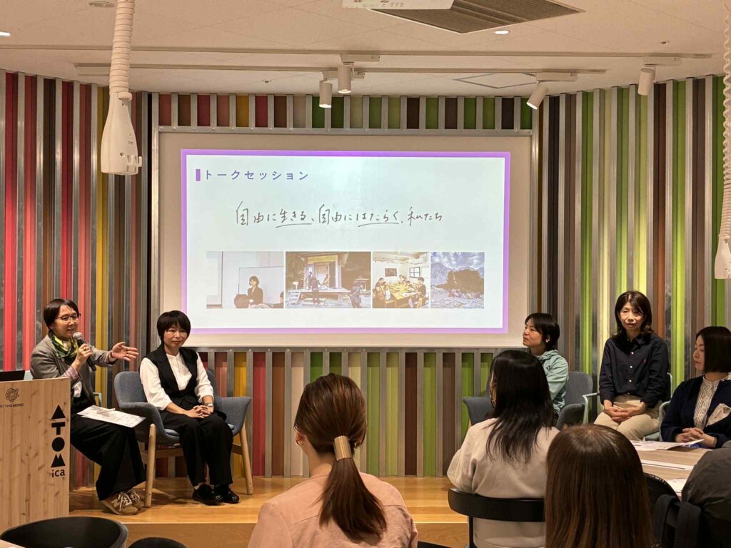 前半はインプットの時間。コーディネーターの郷田郁子さんとゲスト3名による自己紹介、「今につながるあの選択」をテーマに、現在の生き方や働き方につながる印象的な出来事を振り返っていただきました。その後、登壇者4名による「自由」についてのトークセッションが続きました。
