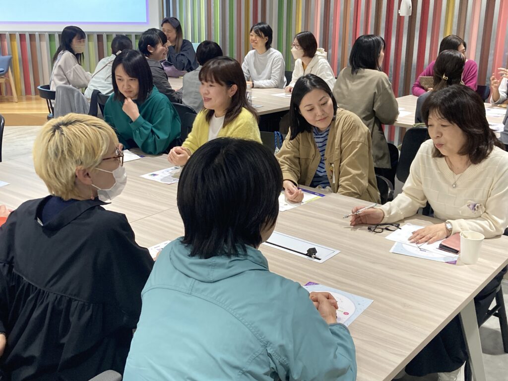 後半はアウトプットの時間。少人数のグループに分かれ、相手の話を丁寧に聞くことを大切にしたダイアローグ(対話)を行いました。初めて会う人同士でも落ち着いて気持ちを伝えあい、安心が広がる場づくりができました。