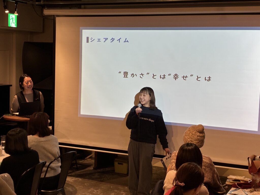 テーマの“豊かさ”から、お金や環境など物質的な話になるのかと想像していたのですが、登壇者の皆さんもそして会場の皆さんからも多く聞こえてきた話は、精神的な心の豊かさについてでした。前回のテーマ“自由”は、環境や家族・会社など、人との関係性から受ける影響が大きいものでしたが、“豊かさ”は自分のなかにあるもので、自分の価値観に深く出会うような時間を過ごしました。